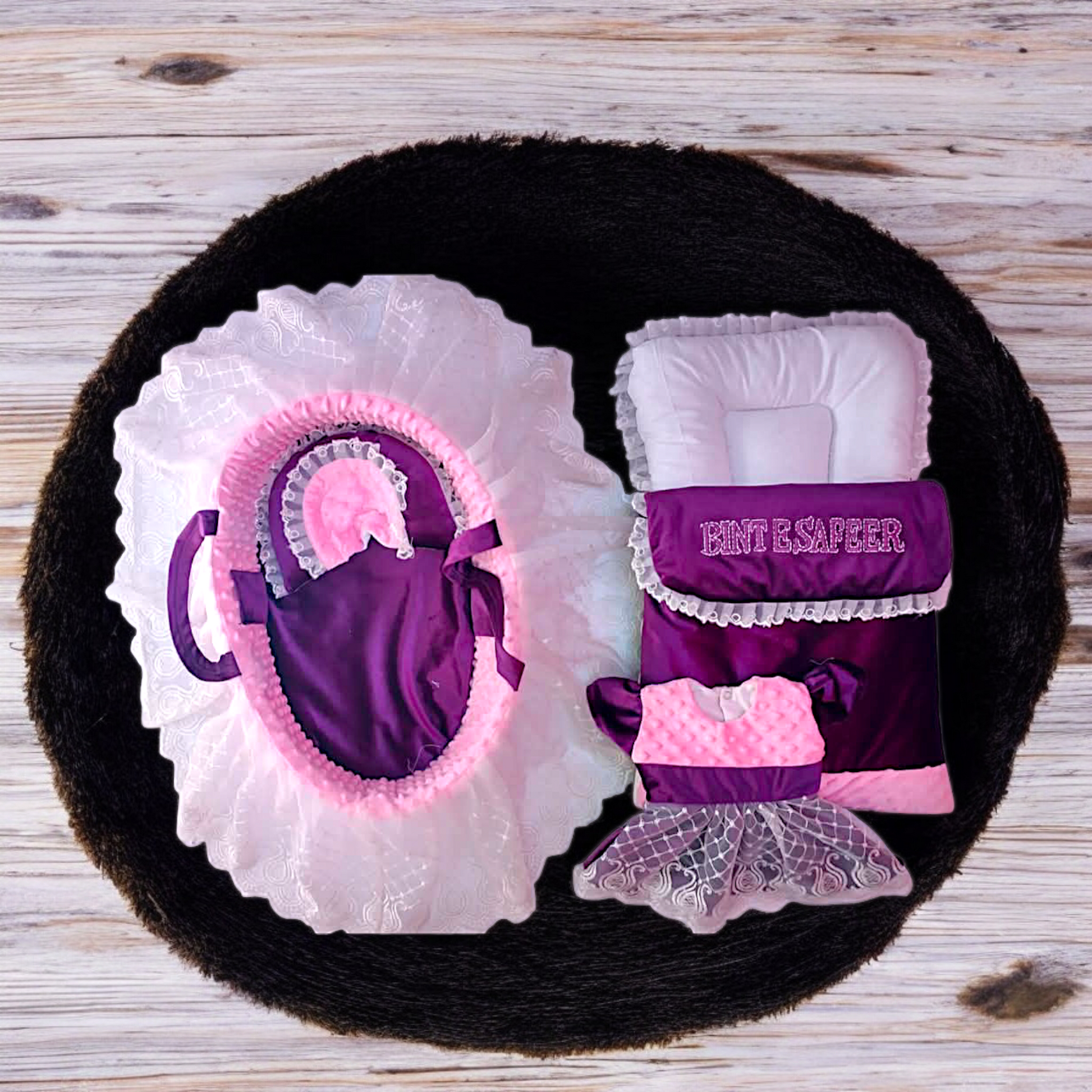Personalize it with your baby's name in Urdu or English, along with their date of birth, and even pictures. Customization can be done on both the carry nest and pillow as shown in the pictures.