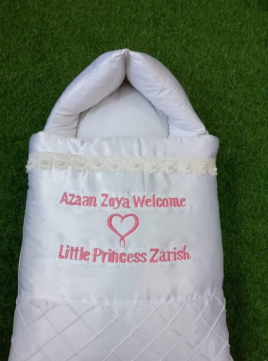 Personalize it with your baby's name in Urdu or English, along with their date of birth, and even pictures. Customization can be done on both the carry nest and pillow as shown in the pictures.